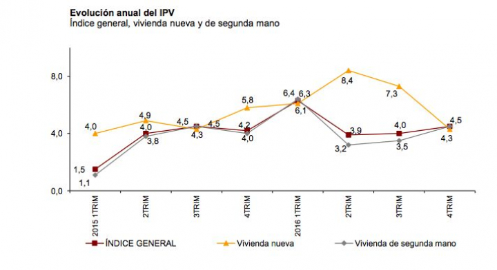 El precio de la vivienda ha subido un 4,5% en 2016, el mayor repunte desde el pinchazo de la burbuja inmobiliaria en 2007, y suma tres años consecutivos al alza, según datos del Instituto Nacional de Estadística (INE).
