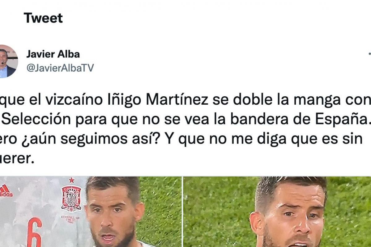 Javier Alba ha visto que el jugador del Athletic de Bilbao Íñigo Martínez llevaba las mangas de la elástica de la selección dobladas y ha escrito: “Y que el vizcaíno Iñigo Martínez se doble la manga con la Selección para que no se vea la bandera de España. Pero ¿aún seguimos así? Y que no me diga que es sin querer”.