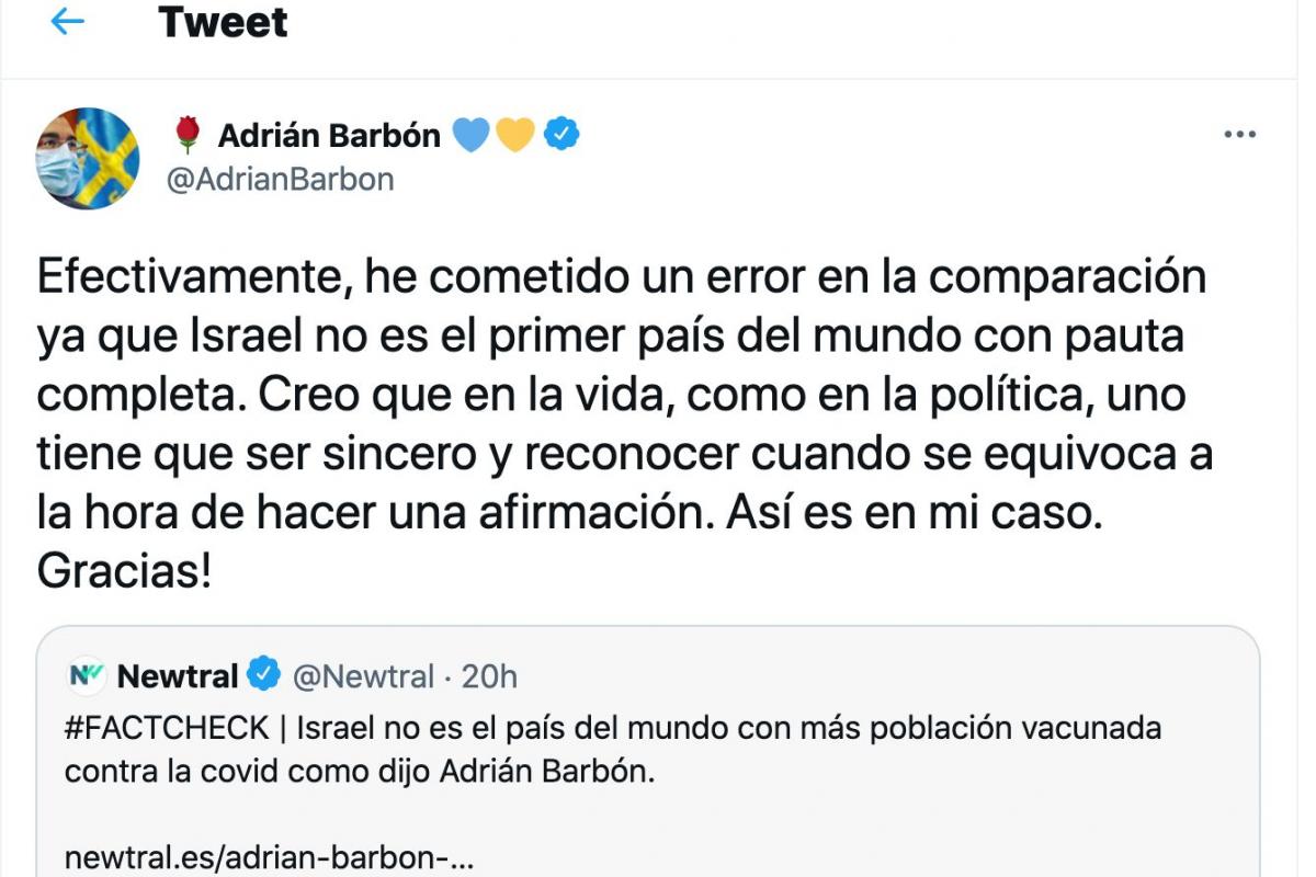 Lejos de echar balones fuera, Barbón se ha hecho cargo de sus palabras y ha pedido perdón: “Efectivamente, he cometido un error en la comparación ya que Israel no es el primer país del mundo con pauta completa. Creo que en la vida, como en la política, uno tiene que ser sincero y reconocer cuando se equivoca a la hora de hacer una afirmación. Así es en mi caso. Gracias!”.