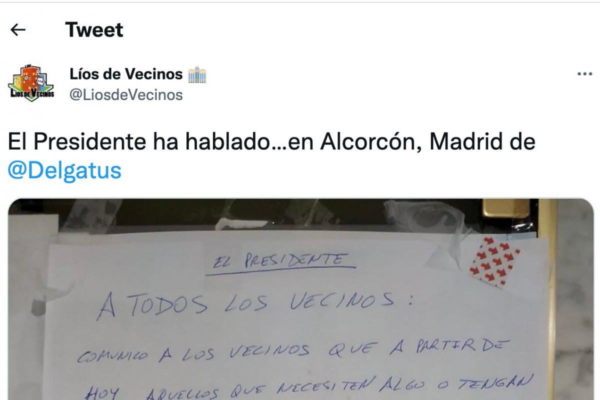 “A todos los vecinos: comunico a los vecinos que a partir de hoy, aquellos que necesiten algo o tengan un problema concreto se dirijan al teléfono del administrador o compañía de seguros del cartel. El único que se comunica con el presidente es la administración, que para eso cobra”, empieza diciendo el presidente en un folio escrito a mano pegado en una zona común.