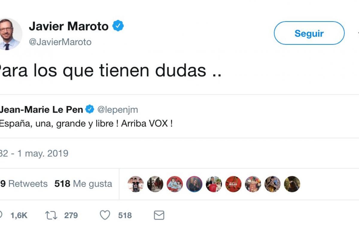 Maroto, que no publicaba un tuit desde la mañana del 28 de abril, ha vuelto a Twitter citando un mensaje en la red social de Jean-Marie Le Pen, político francés de extrema derecha y presidente del Frente Nacional.