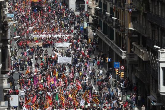 Acompañados por el líder de Podemos, Pablo Iglesias, y el de Izquierda Unida, Alberto Garzón, los sindicatos han iniciado su marcha en la Plaza de Neptuno, que terminará en la Puerta del Sol, haciendo públicas duras críticas a los casos de corrupción mientras los trabajadores no terminan de ver la recuperación.