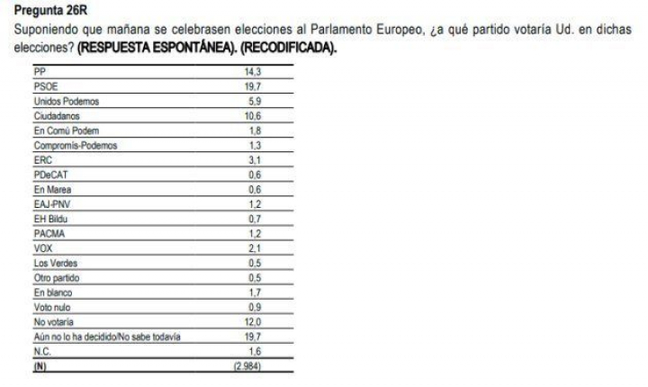 Sin embargo, hay que tener en cuenta que la pregunta no incluye las listas que se presentarán finalmente a las elecciones europeas, ya que el CIS ha preguntado por las candidaturas que se presentaron a las últimas elecciones generales.