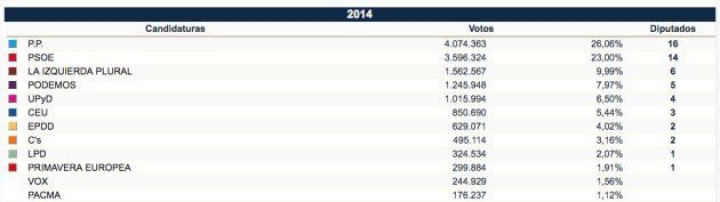 El PP ganó esos comicios con el 26,06% de los votos. La lista liderada por Miguel Arias Cañete se hizo con 16 de los 54 eurodiputados que España repartía entonces. El PSOE con Elena Valenciano quedó en segunda posición con el 23% de los votos y 14 eurodiputados.