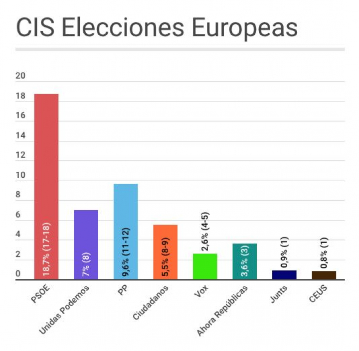 El PSOE ganaría las próximas elecciones europeas del 26 de mayo con un 18,7% de los votos y entre 17 y 18 escaños frente a los 14 con los que cuenta ahora en el Parlamento Europeo, según el barómetro prelectoral del CIS conocido este jueves.
