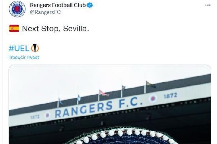 “Next Stop, Sevilla”, ha publicado el club desde su cuenta oficial en referencia a la final de la Europa League que se disputará en Sevilla el próximo 18 de mayo entre el propio Rangers y el Eintracht de Frankfurt.
