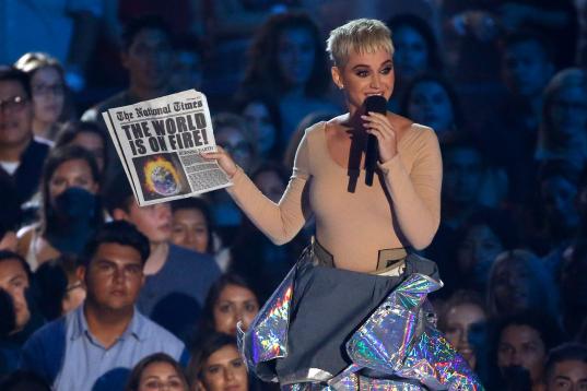 Perry fue precisamente la maestra de ceremonias de los VMA. La cantante apareció flotando como si fuera una astronauta y a lo largo de la noche soltó varias críticas, no totalmente explícitas, dirigidas al presidente de EE UU, Donald Trump. "Incluso en el apocalipsis, necesitamos una buena banda sonora", señaló Perry en tono esperanzado poco antes de dar comienzo a la gala.