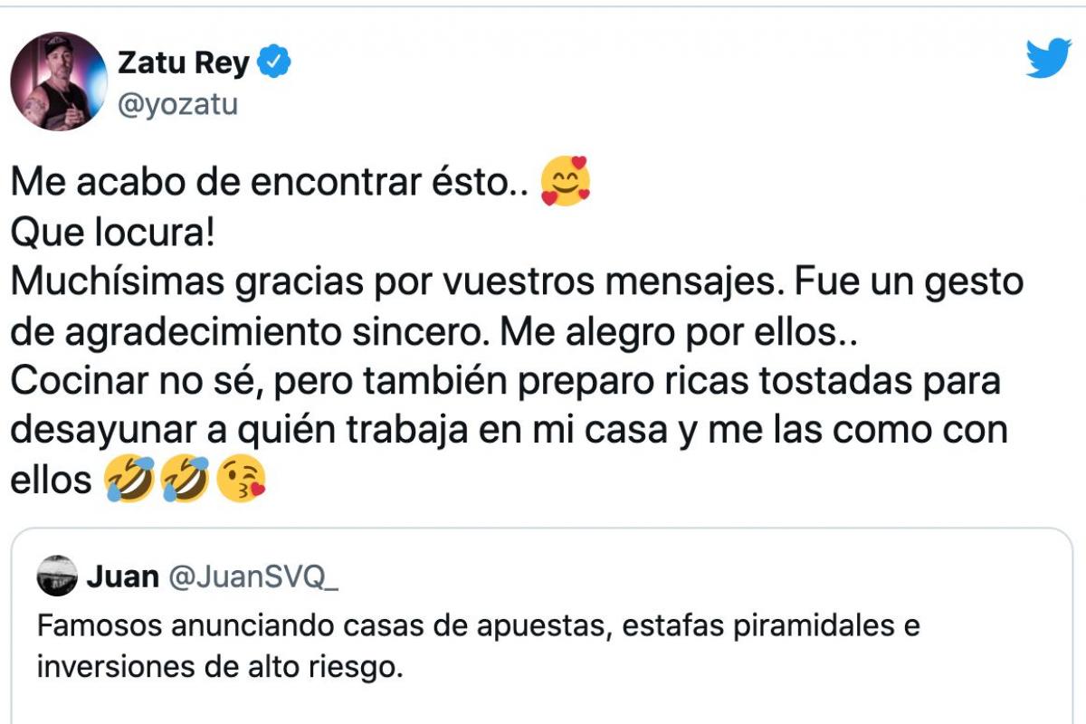 Ese tuit ha llegado hasta el propio Zatu, que ha respondido con otro mensaje que ha tenido gran repercusión en Twitter: “Me acabo de encontrar esto.. 🥰 Qué locura! Muchísimas gracias por vuestros mensajes. Fue un gesto de agradecimiento sincero. Me alegro por ellos.. Cocinar no sé, pero también preparo ricas tostadas para desayunar a quien trabaja en mi casa y me las como con ellos”.