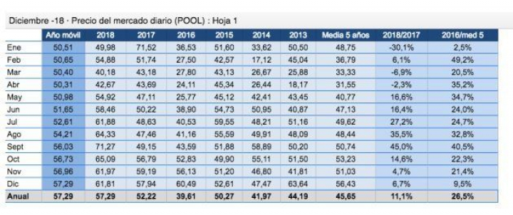 No conviene olvidar que el año 2018 ya fue un año con precios muy altos en la electricidad: fue un 11,1% más caro que en 2017 y un 26,5% más elevado que la media de los últimos cinco años.