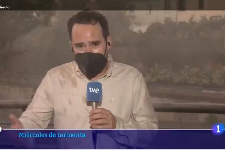 En esa pieza que ha compartido la cuenta de Twitter del ente público se ve al periodista completamente empapado y aguantando el chaparrón ante las cámaras.