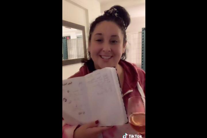 En el vídeo vemos a Schall vestida de chandal agarrada a una copa de vino que rellena al comienzo de la grabación.