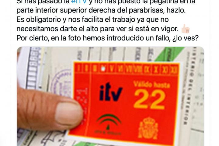 Lo hace en un tuit en el que recuerda a los ciudadanos, ya sean de Granada o no, que si le han hecho la ITV a su vehículo, deben poner la pegatina en la parte interior superior derechas del parabrisas.
