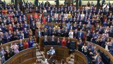 Por primera vez ministros de un gobierno de coalición han ocupado los bancos azules del hemiciclo, cuyo espacio ha sido habilitado para acoger a los 350 diputados y 266 senadores asistentes a esta sesión conjunta.