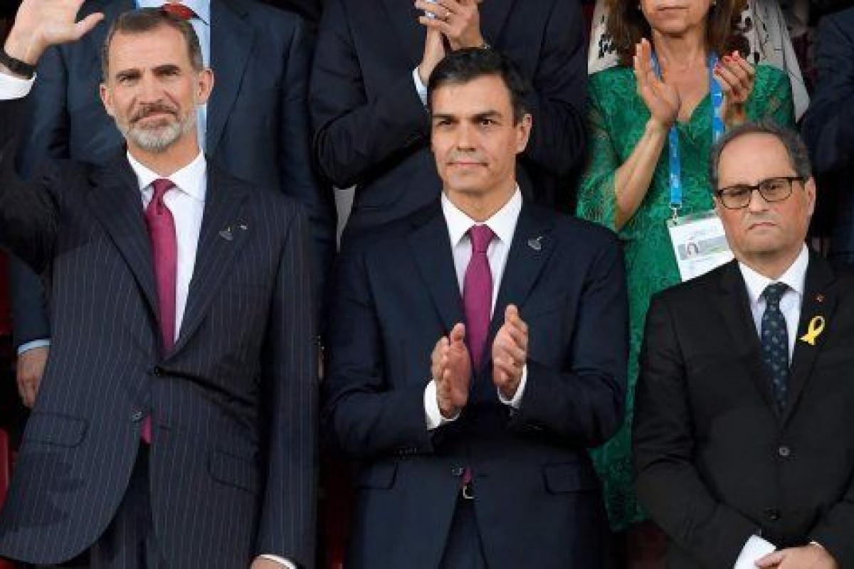 El rey Felipe VI, el presidente del Gobierno Pedro Sánchez y el president de la Generalitat Quim Torra en la ceremonia de apertura de los Juegos del Mediterráneo.AFP