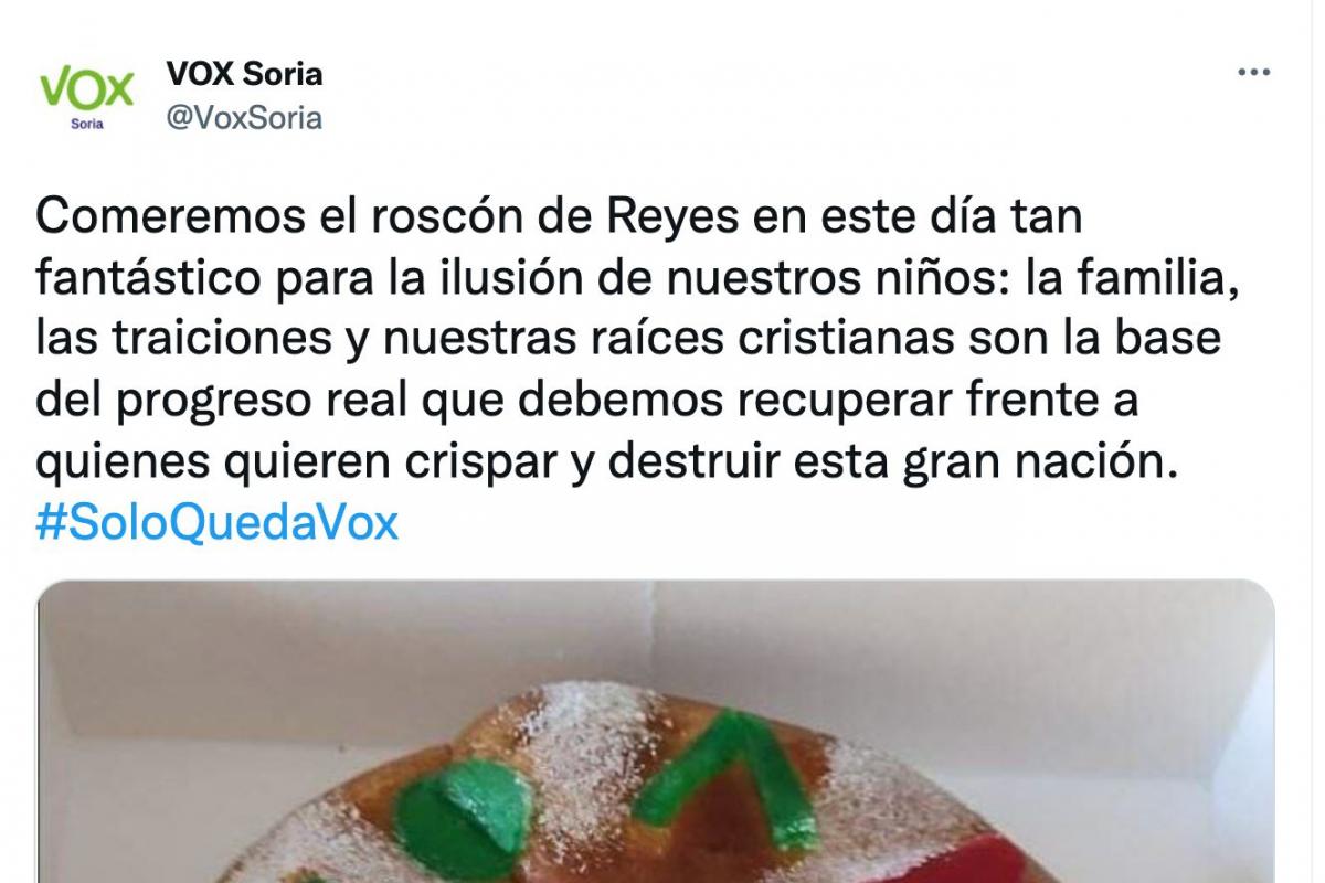 “Comeremos el roscón de Reyes en este día tan fantástico para la ilusión de nuestros niños: la familia, las traiciones y nuestras raíces cristianas son la base del progreso real que debemos recuperar frente a quienes quieren crispar y destruir esta gran nación”, dicen desde la cuenta de Vox Soria, con 2.642 seguidores, entre ellos, la cuenta oficial del partido.