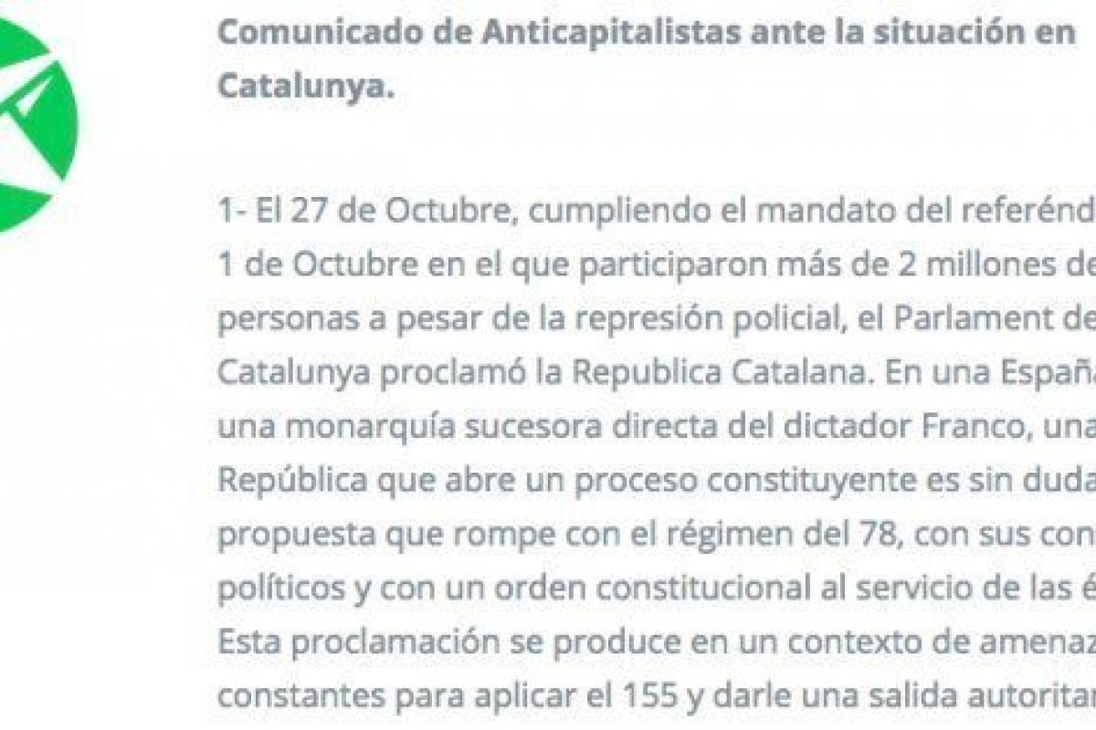 Anticapitalistas ha emitido un comunicado "ante la situación en Catalunya", en el que argumenta que la proclamación se ha producido en un contexto "de amenazas constantes para aplicar el 155", una "salida autoritaria" a un conflicto que, a su juicio, "tiene que tener una salida eminentemente política y democrática".