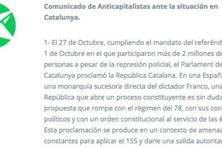Por ello, Anticapitalistas llama a "rechazar" la aplicación del artículo 155 y a la defensa democrática, pacífica y desobediente de la voluntad del pueblo catalán y su derecho a decidir".