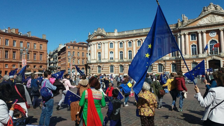Este mediodía, al dirigirme a la Plaza del Capitole para mi cita cuasi-semanal con el excelente chef Christian Constant, me he topado con un curioso espectáculo: un grupo de unos 60 ciudadanos bailando un Sirtaki envueltos en banderas europeas.