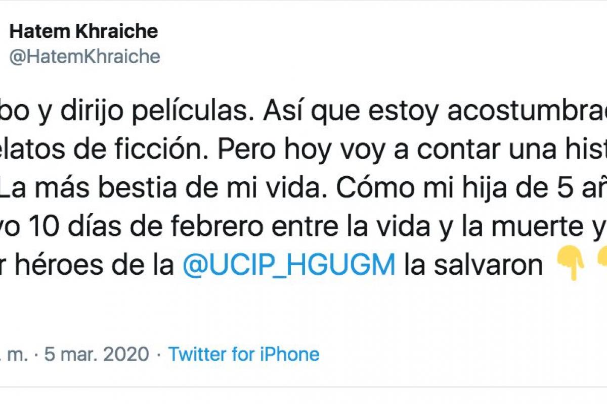 Hatem Khraiche, director de cine salmantino nominado en 2008 al Goya al mejor cortometraje de ficción por Machu-Pichu, ha compartido en su cuenta de Twitter la sobrecogedora experiencia que ha vivido con su hija de cinco años.