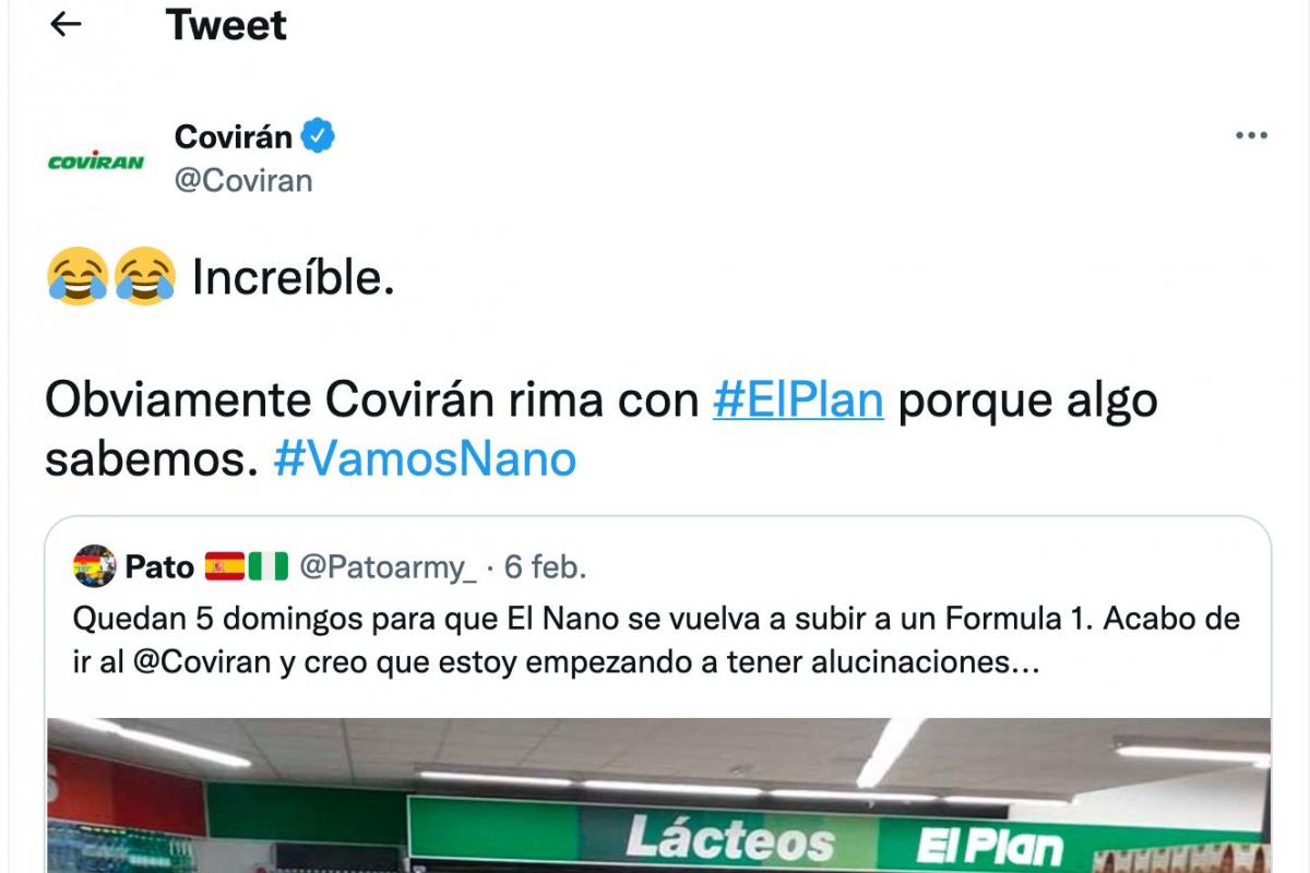 La cuenta oficial de Covirán ha respondido al mensaje diciendo: ”Increíble. Obviamente Covirán rima con #ElPlan porque algo sabemos. #VamosNano”. Un mensaje que tiene en pocas horas casi 3.000 ‘me gusta’ y más de 200 compartidos.