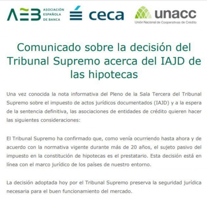Las entidades financieras han aplaudido el resultado de la reunión. " La decisión adoptada hoy por el Tribunal Supremo preserva la seguridad jurídica necesaria para el buen funcionamiento del mercado", han señalado en un comunicado conjunto de las patronales bancarias AEB (bancos), CECA (antiguas cajas de ahorro) y UNACC (cajas rurales).