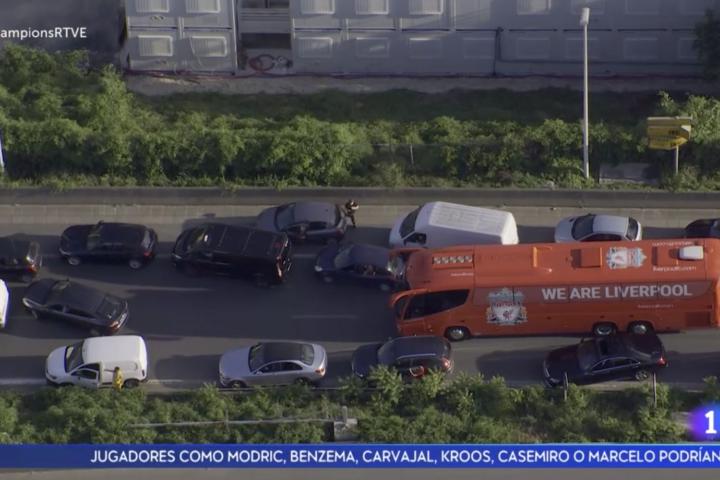 Varios coches aparcados y quietos en la carretera impedían al autobús ‘red’ avanzar hacia el estadio, lo que ha provocado una escena surrealista.