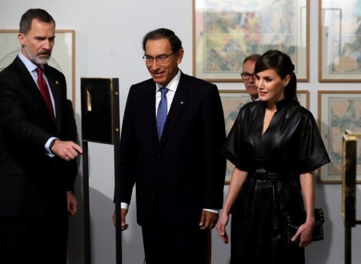 La reina ha elegido un look estilo rockero también muy llamativo: un vestido de cuero negro con cinturón de And other stories, unos zapatos estilo salón color nude y un bolso de mano de cuero negro con tachuelas.