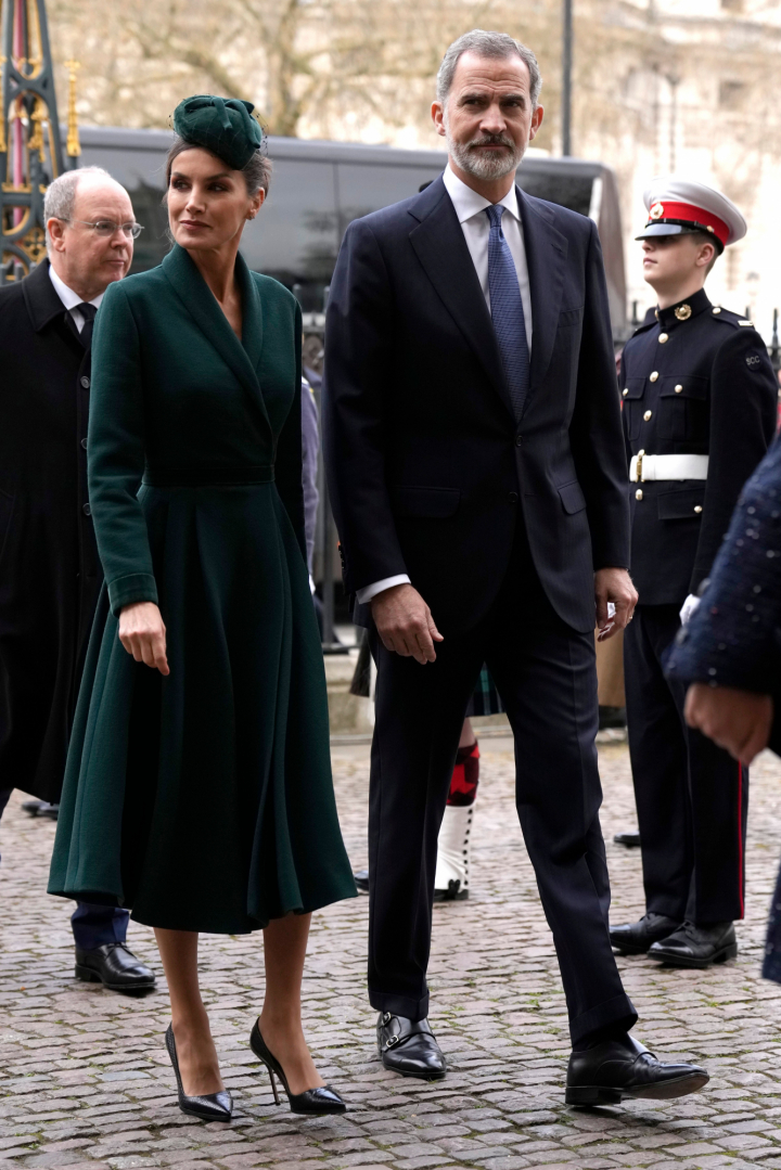 El color del atuendo de Letizia no es casual y ejerce de homenaje a Felipe de Edimburgo. El marido de Isabel II, como recuerdo la cadena británica Sky News, tenía un color oficial, el verde Edimburgo, que utilizaba su personal y que también se usaba para sus vehículos oficiales.