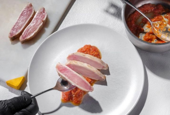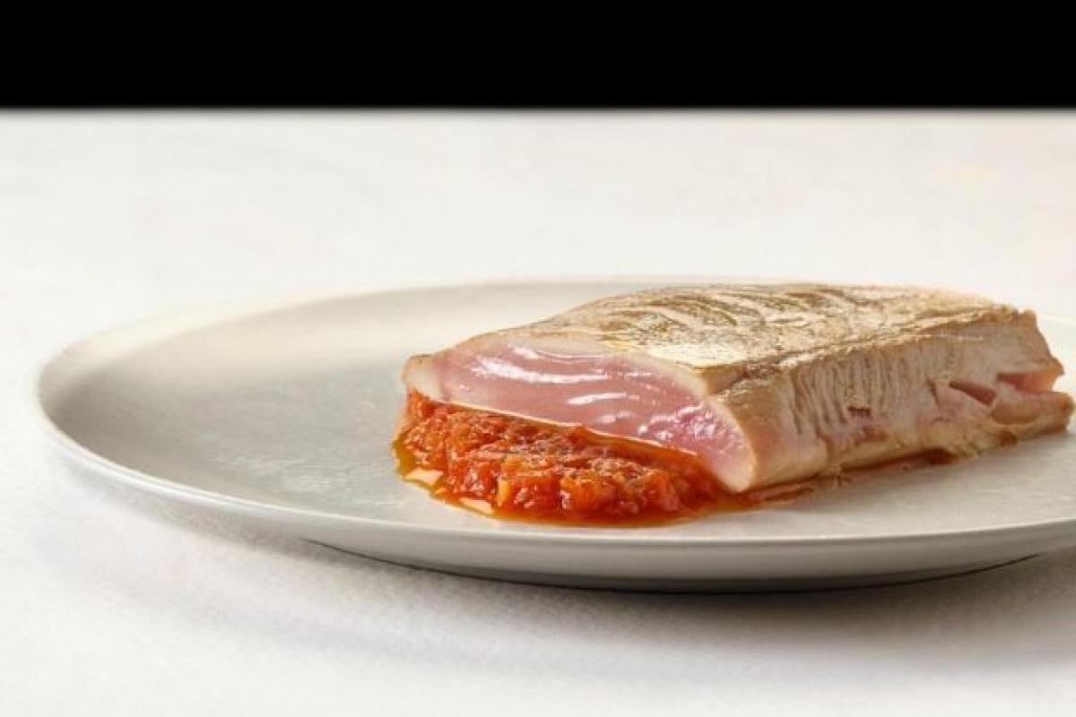 Esta temporada, en Lakasa elaboramos este tarantelo de bonito a la plancha, poquito hecho, para que conserve toda su jugosidad en el posterior paso por la boca. Lo acompañamos de una salsa casera de un tomate de temporada maduro, de la variedad corazón de buey, procedente de una finca de cultivo ecológico ubicada en Zamora.