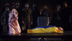 El pasado domingo, el teatro madrileño homenajeó a las víctimas ucranianas en la última representación de El ocaso de los dioses, ópera de Wagner, envolviendo el cadáver de Siegfried en una bandera de Ucrania.