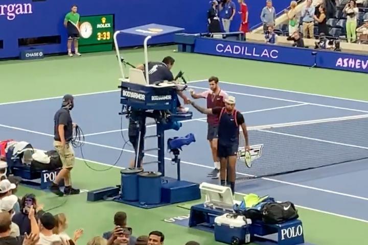 Tras finalizar el partido, ambos tenistas se acercaron al juez de silla para estrecharle la mano. Antes de llegar al banquillo, Kyrgios propinó, raqueta en mano, repetidos golpes contra el suelo.