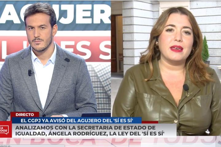 El periodista Diego Losada, presentador de En Boca de Todos, en Cuatro, ha mantenido un tenso intercambio con Ángela Rodríguez ‘Pam’, secretaria de Estado de Igualdad, tras la revisiones de varias sentencias que han supuesto la rebaja de penas a varios condenados por delitos sexuales por la ley ‘Solo sí es sí’.