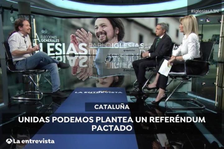 Vicente Vallés y Sandra Golpe han entrevistado a Pablo Iglesias, líder de Podemos, en Antena 3 noticias.