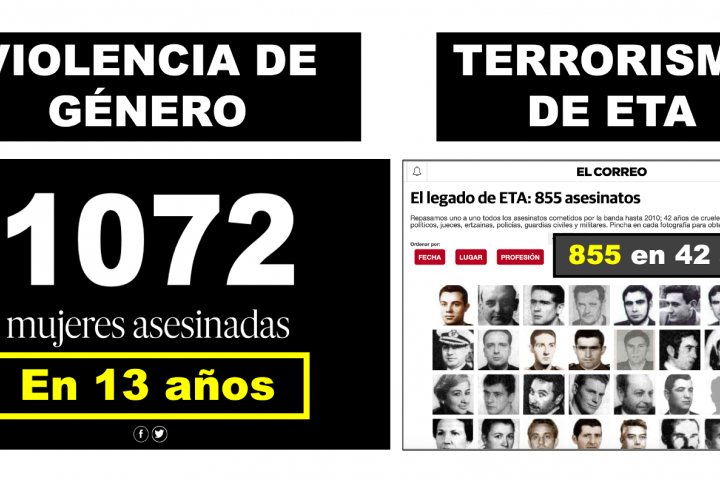ETA, una banda terrorista y cruel del pasado, asesinó en 42 años a 855 personas. La violencia de género, una violencia cruel y terrible del presente, ha asesinado a 1.072 mujeres en 13 años.