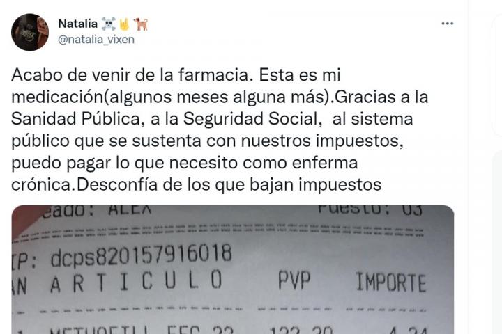 Las ventajas de contribuir todos y pagar impuestos reflejadas en una sola foto. Natalia de Castro, una madrileña de 40 años y con cinco enfermedades raras relacionadas con las patologías autoinmunes, ha publicado el ticket de una compra en una farmacia.