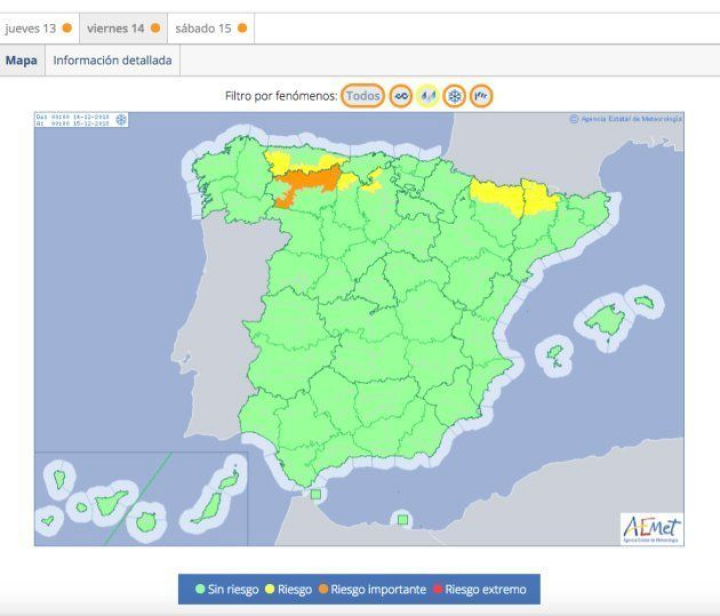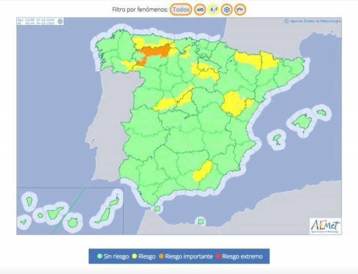El riesgo por nevadas afectará a Granada, Huesca, Teruel, Lérida, Castellón, Orense, Asturias, Cantabria, La Rioja, Huesca, Teruel, Lérida Castellón, Burgos, Palencia, Soria, Segovia, Ávila, Zamora, mientras que León tendrá riesgo importante por nevadas.