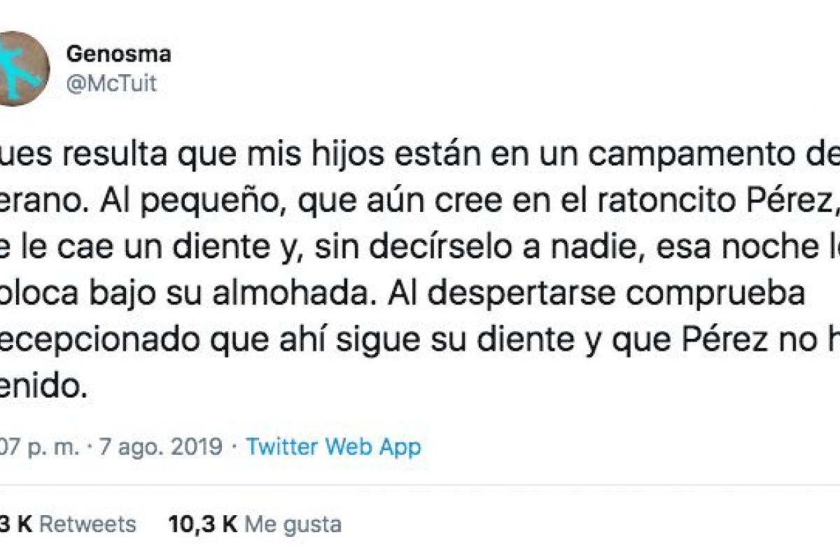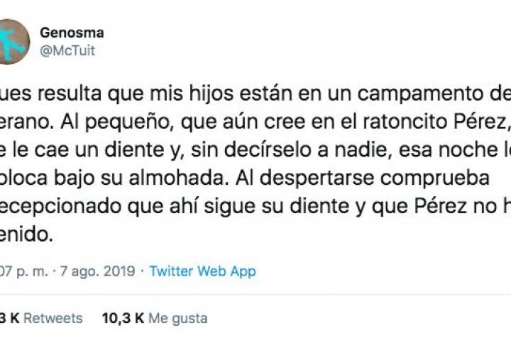 “Al pequeño, que aún cree en el Ratoncito Pérez, se le cae un diente y, sin decírselo a nadie, esa noche lo coloca bajo su almohada. Al despertarse comprueba decepcionado que ahí sigue su diente y que Pérez no ha venido”, escribe en el primer tuit de su hilo, que supera en un día los 10.400 me gusta.