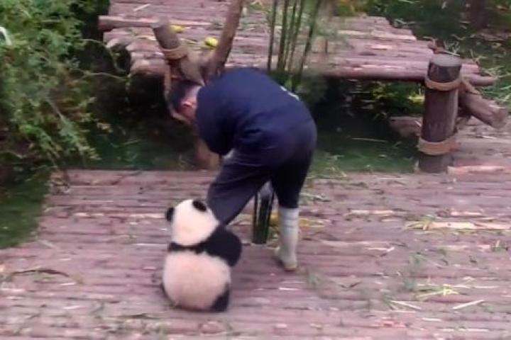 Tal y como se puede ver en las imágenes, el cuidador trata de limpiar el espacio en el que viven los osos pero la cría de panda no le permite hacerlo.
