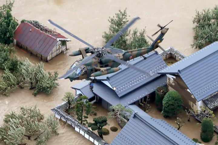 La cadena pública NHK difundió desde primera hora de este domingo imágenes de los dramáticos rescates en helicóptero y barcas en áreas residenciales inundadas por los desbordamientos fluviales. Hasta el momento se han confirmado en al menos una decena de ríos.