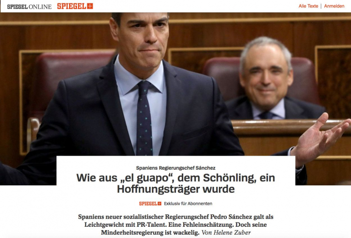 La revista digital alemana Der Spiegel ha seguido por esa línea y no duda en llevar a su titular el apodo ‘El Guapo’, escrito en español, junto al nombre de Pedro Sánchez.