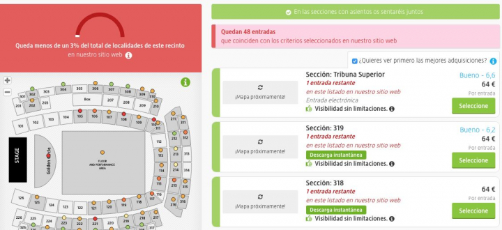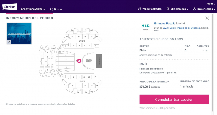 A esto se une que los portales no especifican que son una página de reventa, lo que puede confundir al comprador. Una vez que el usuario entra en el proceso de compra puede seleccionar en un mapa las localidades como si se tratase del canal oficial de venta. Eso sí, una vez que se elige una, por ejemplo, en grada —que en el concierto de Rosalía llegaron a superar los 200 euros— no se especifica el asiento, ni el sector.