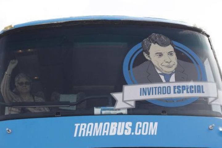 El tramabús estacionó ayer en la Audiencia Nacional, en San Fernando de Henares, donde acudía como testigo a declarar en el juicio de Gürtel la expresidenta y actual portavoz del PP en el Ayuntamiento de Madrid, Esperanza Aguirre.