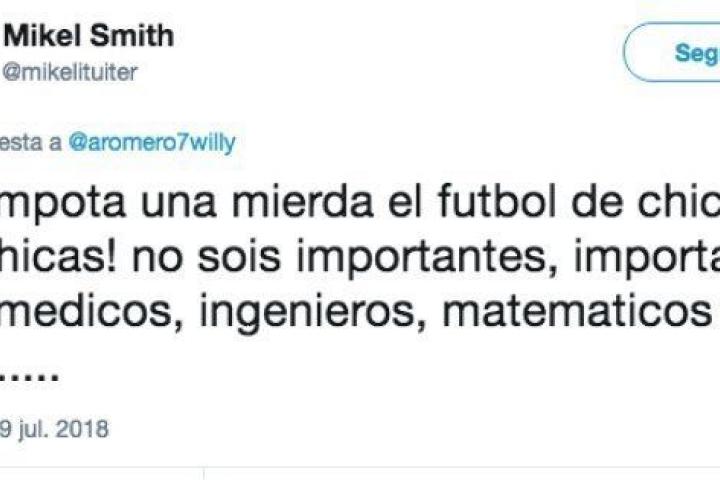 Sin embargo, no recogió el aplauso unánime de los usuarios, ya que el usuario @mikelituiter le contestó lo siguiente: "Me importa una mierda el fútbol de chicos o de chicas. No sois importantes, importantes son médicos, ingenieros, matemáticos, etc.".