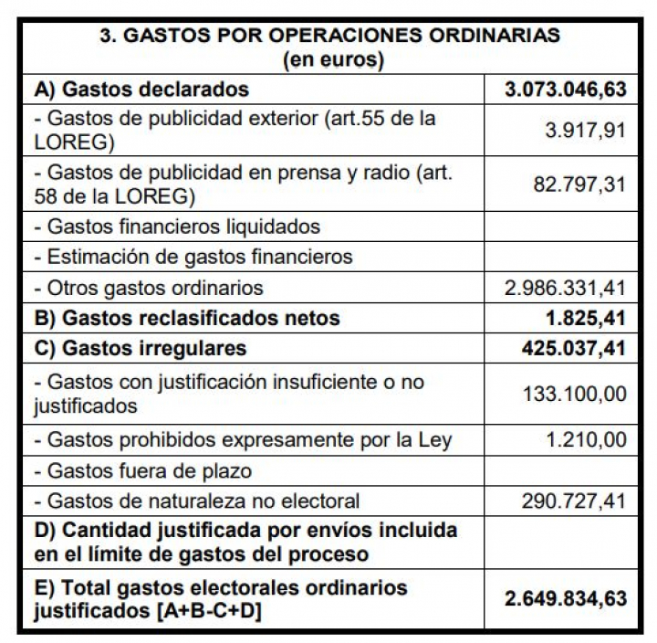 Además de estos gastos no justificados, la coalición presentó gastos por operaciones ordinarias por un importe de 290.727,14 euros que no debían haber sido incluidos en la contabilidad de los comicios. “Cuyos conceptos no tienen la consideración de gasto electoral con arreglo a lo establecido en el artículo 130 de la LOREG”, explica el Tribunal.