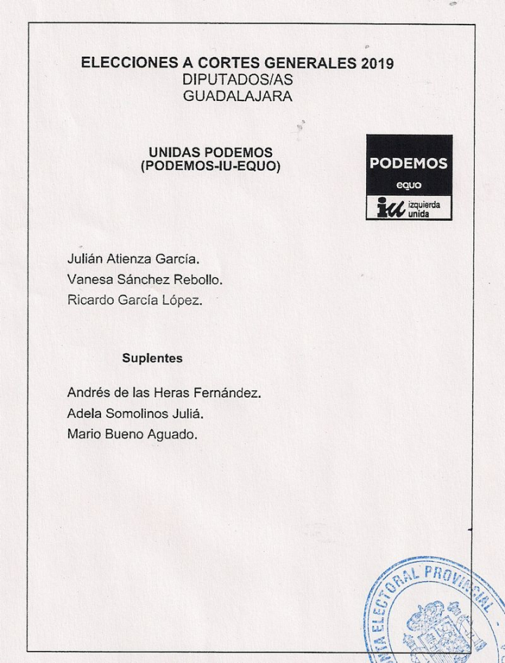 La coalición se presentó a las elecciones del 28 de abril de 2019 en la provincia de Guadalajara con el nombre de Unidas Podemos y las siglas PODEMOS-IU-EQUO, como se puede ver en la papeleta en la página web de Izquierda Unida. Esta sería la denominación que tendría que haber aparecido en las pancartas para ser considerado gasto electoral.