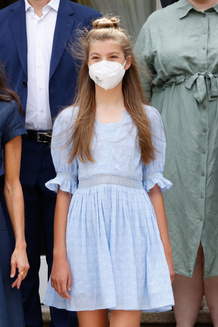 Sofía vistió un vestido azul estilo baby doll de Springfield que, como el de Mango, también se diseñó con escote en pico. La prenda se modificó con un trozo del tejido del vestido y se colocó por debajo del escote, dejando un ribete con encaje en la parte superior.