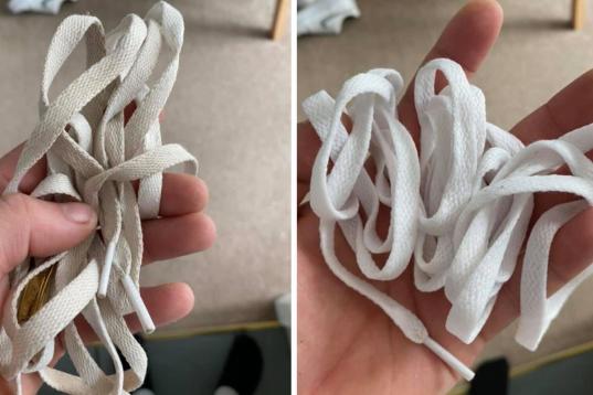 Usar un quitagrasas; colocar los cordones y rociarlos bien con el producto, a continuación hay que frotarlos bien y exprimirlos. Dejar actuar el quitagrasas durante unos cinco minutos. A continuación, agarrar un extremo del cord&oa...