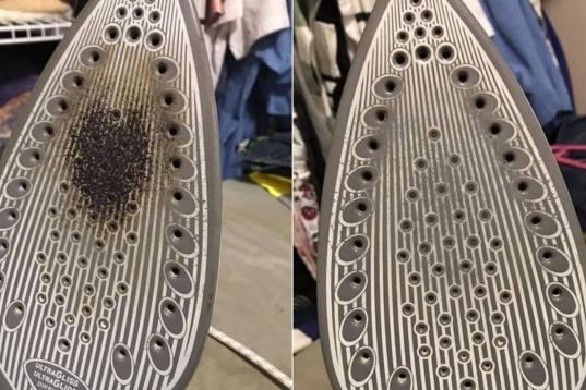 Encender la plancha y esperar a que se caliente. Sostener una pastilla de paracetamol con unas pinzas. Recorrer la base de la plancha con el paracetamol y dejar que se vaya deshaciendo. Limpiar con un paño mojado en agua y vinagre para ac...