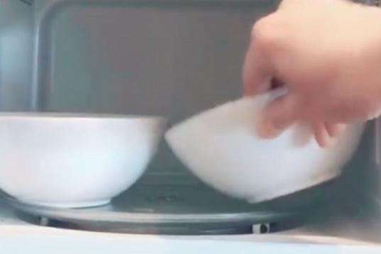 Además de los dos boles, hay que meter una taza. Su función es calentar a dos alturas. Un bol en el plato giratorio y otro, sobre la taza.
