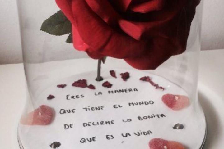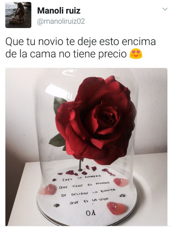 En una primera escena, la tuitera @manoliruiz02 muestra una escena salida de un cuento de Disney con una rosa en una vitrina acompañada de una nota que dice "eres la manera que tiene el mundo de decirme lo bonita que es la vida".